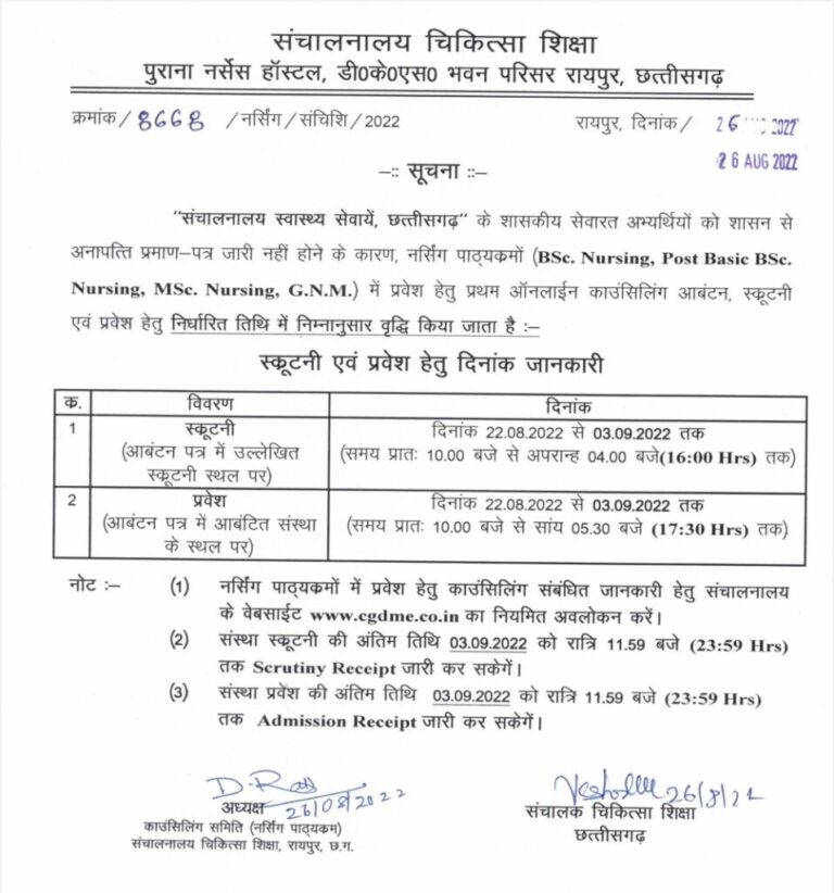 रायपुर 26 अगस्त 2022। संचालनालय चिकित्सा शिक्षा, रायपुर छ.ग. के निर्देशानुसार संचालनालय स्वास्थ्य सेवाएं, छत्तीसगढ़ के शासकीय सेवा में कार्यरत...
