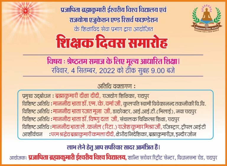 रायपुर । 03 सितम्बर:शिक्षक दिवस के अवसर पर प्रजापिता ब्रह्माकुमारी ईश्वरीय विश्व विद्यालय के शिक्षाविद सेवा प्रभाग द्वारा रविवार 4...