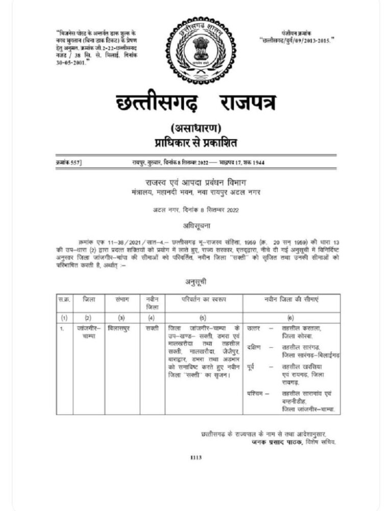 रायपुर 08 सितम्बर 2022/ राज्य शासन द्वारा नवीन जिले ‘‘मनेन्द्रगढ़-चिरमिरी-भरतपुर’’ और ‘‘सक्ती’’ के गठन की अधिसूचना आज राजपत्र में प्रकाशित...