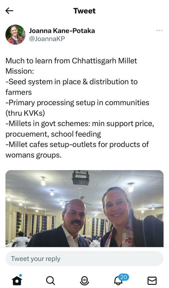 सुश्री पोटाका ने ट्वीट कर छत्तीसगढ़ मिलेट मिशन के कार्यों की तारीफ की कृषि विश्वविद्यालय के कुलपति डॉ. चंदेल ने...