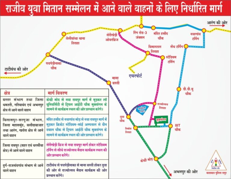 राजीव युवा मितान सम्मेलन के लिए रूट चार्ट रायपुर, 01 सितंबर, 2023/ रायपुर की यातायात पुलिस ने शनिवार को नवा...
