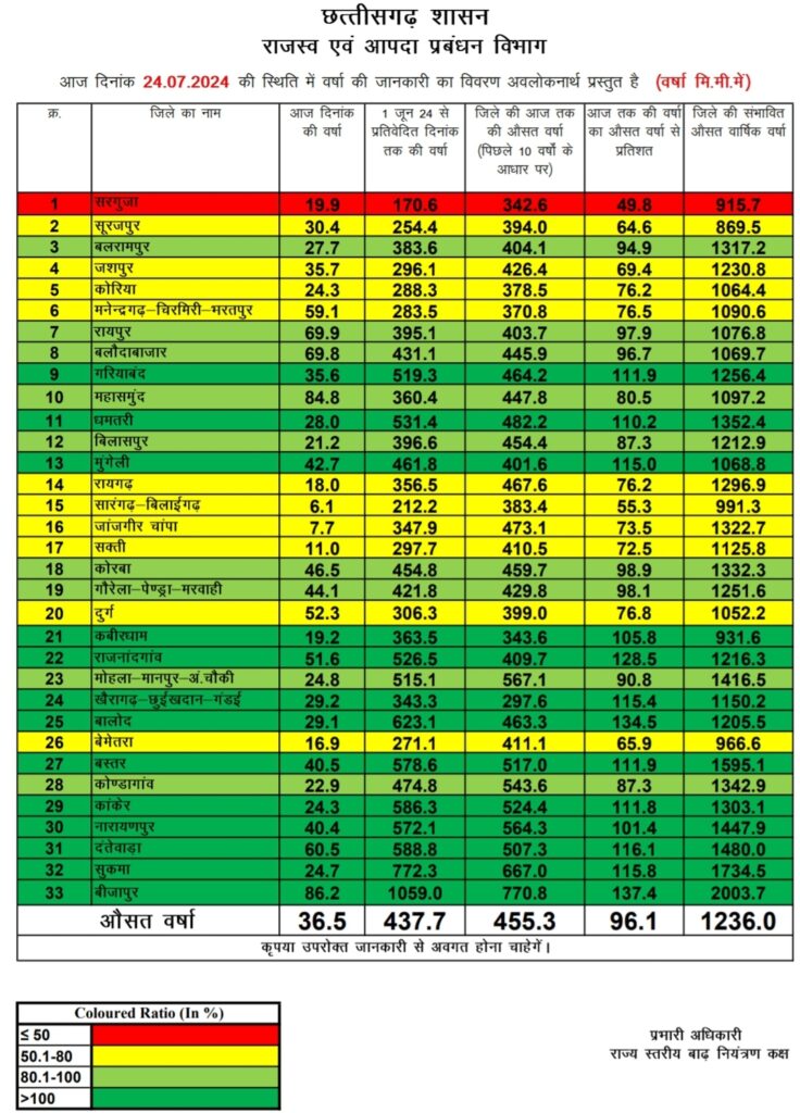 रायपुर, 24 जुलाई 2024/राज्य शासन के राजस्व एवं आपदा प्रबंधन विभाग द्वारा बनाए गए राज्य स्तरीय नियंत्रण कक्ष द्वारा संकलित...