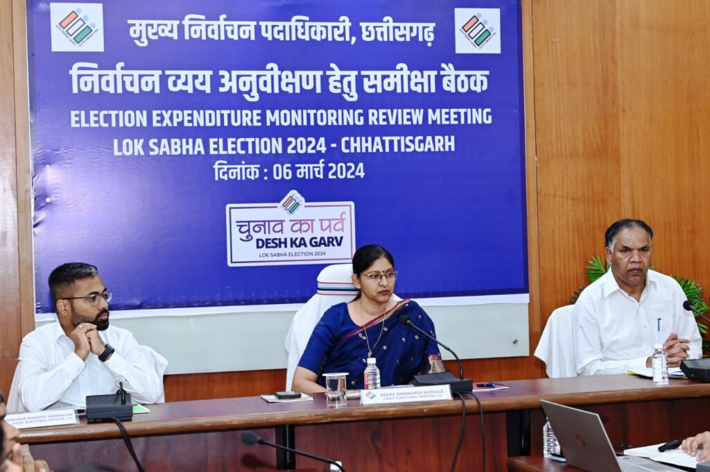 रायपुर. 6 मार्च 2024. मुख्य निर्वाचन पदाधिकारी श्रीमती रीना बाबासाहेब कंगाले ने आगामी लोकसभा निर्वाचन के दौरान निर्वाचन व्यय अनुवीक्षण के लिए राज्य में कार्यरत सभी इनफोर्समेंट एजेंसीज की बैठक लेकर आवश्यक निर्देश दिए। उन्होंने आज मुख्य निर्वाचन पदाधिकारी कार्यालय में आयोजित बैठक में दिसम्बर-2023 में राज्य में संपन्न हुए विधानसभा आम निर्वाचन के दौरान निर्वाचन व्यय अनुवीक्षण में इन एजेंसीज द्वारा किए गए कार्यों की समीक्षा की। बैठक में अधिकारियों को निर्वाचन व्यय अनुवीक्षण के लिए ईएसएमएस (Election Seizure Management System) एप और पोर्टल पर काम करने का प्रशिक्षण भी दिया गया। अतिरिक्त मुख्य निर्वाचन पदाधिकारी श्री निलेशकुमार महादेव क्षीरसागर और संयुक्त मुख्य निर्वाचन पदाधिकारी श्री पी.एस. ध्रुव भी समीक्षा बैठक में शामिल हुए।