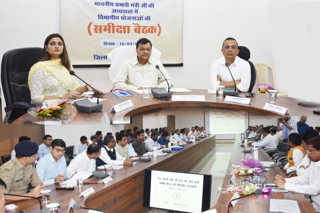 रायपुर, 16 मार्च 2024। छत्तीसगढ़ शासन के वाणिज्य एवं उद्योग और श्रम मंत्री एवं कबीरधाम जिले के प्रभारी मंत्री श्री लखनलाल देवांगन ने आज शनिवर को सबेरे 11 बजे जिला कलेक्टोरेट के सभाकक्ष में अधिकारियों की बैठक लेकर विभागीय काम-काज की समीक्षा की। कैबिनेट मंत्री श्री देवांगन ने कहा कि कबीरधाम जिले में लगातार विकास कार्य हो रहे हैं। जनप्रतिनिधि और अधिकारी जिले के विकास के लिए अच्छा कार्य कर रहें हैं। उन्होंने कहा कि हमारा मुख्य उद्देश्य शासन की जन कल्याणकारी योजनाओं का क्रियान्वयन जमीनी स्तर पर हो और इसका लाभ अंतिम व्यक्ति तक मिलना चाहिए। सभी को उत्साह के साथ टीम भावना से कार्य करते हुए सभी क्षेत्रों में कबीरधाम जिले की पहचान बनाना है।