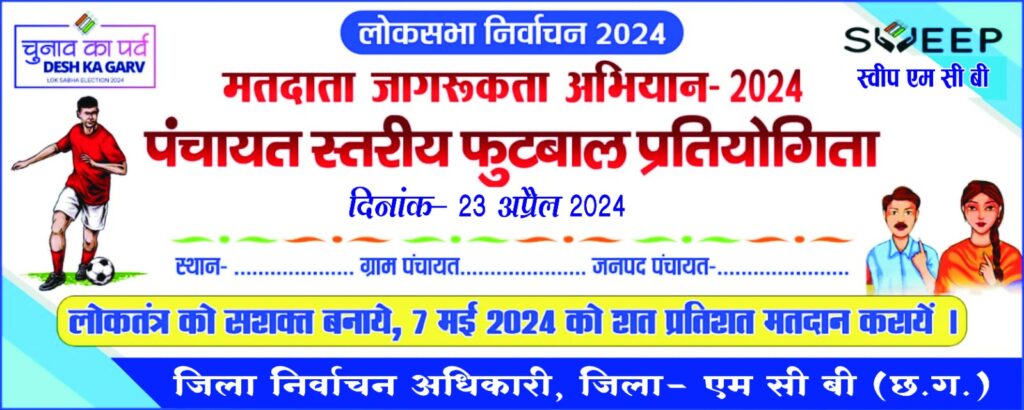 मनेंद्रगढ़/19 अप्रैल 2024/ कलेक्टर एवं जिला निर्वाचन अधिकारी श्री डी.राहुल वेंकट के निर्देशानुसर तथा स्वीप नोडल अधिकारी नितेश उपाध्याय के मार्गदर्शन में जिले भर में मतदाता जागरूकता कार्यक्रम का आयोजन किया जा रहा है। इसी कड़ी में जनपद पंचायत खड़गवां के समस्त ग्राम पंचायतों में मतदाताओं को प्रेरित करने के लिए प्रतिदिन सुबह 07ः00 से फुटबाल मैच का आयोजन किया जाना है। पंचायत स्तरीय फुटबॉल मैच का आयोजन 23 अप्रैल 2024 से प्रारंभ किया जाना है। जनपद पंचायत सीईओ विनोद जायसवाल ने समस्त ग्राम सचिवों को इसके लिए व्यापक तैयारी कर अधिक से अधिक लोगों मतदान प्रेरित करने आग्रह किया है।