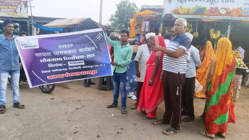 मनेन्द्रगढ़/ 22 अप्रैल 2024/ लोकसभा निर्वाचन 2024 में शत-प्रतिशत मतदान करने के लिए जिले में लगातार मतदाता जागरूकता अभियान चलाया जा रहा है। इसी परिपेक्ष्य में गतदिवस जिला प्रशासन के निर्देशन पर जनपद पंचायत भरतपुर के हाट बाजार में मतदाता जागरूकता अभियान चलाया गया। इस अवसर पर यहाँ विभिन्न कार्यक्रम के जरिये नागरिकों को मतदान का महत्व बताया गया। मानव श्रृंखला बनाकर राष्ट्रीय एकता का संदेश दिया गया। जागरूकता रैली निकालकर प्रेरित कारी संदेश के माध्यम से एक एक मतदान के महत्व को रेखांकित किया गया। इस अवसर हाट-बाजार में उपस्थित नागरिकों को मतदान करने शपथ दिलाया गया।