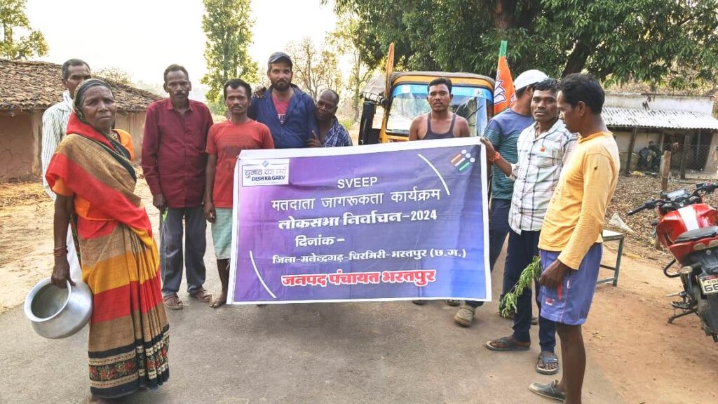 मनेन्द्रगढ़/ 24 अप्रैल 2024/ कलेक्टर एवं जिला निर्वाचन अधिकारी श्री डी. राहुल वेंकट के निर्देशन एवं परियोजना निदेशक श्री नितेश उपाध्याय के कुशल मार्गदर्शन में जिले भर में स्वीप कार्यक्रम के तहत विभिन्न माध्यमों से मतदाताओं का जागरूक किया जा रहा है। विगत दिवस ग्राम पंचायत में मतदाता जागरूकता अभियान स्वीप कार्यक्रम सम्पन्न कराया गया। विकासखंड भरतपुर के ग्राम शेरी, कुदरा एवं मसौरा में मतदाता जागरूकता अभियान स्वीप कार्यक्रम का आयोजन किया गया। यह कार्यक्रम जनपद पंचायत भरतपुर से स्वीप नोडल पवन सिंह चंदेल एवं सहायक नोडल हीरा सिंह के द्वारा करवाया गया। इस दौरान उपस्थित ग्रामीणों को 7 मई 2024 को होने वाले लोकसभा सामान्य निर्वाचन 2024 में मतदान करने एवं अपने आस पास के सभी लोगों को मतदान करने हेतु जागरूक करने प्रेरित किया गया।