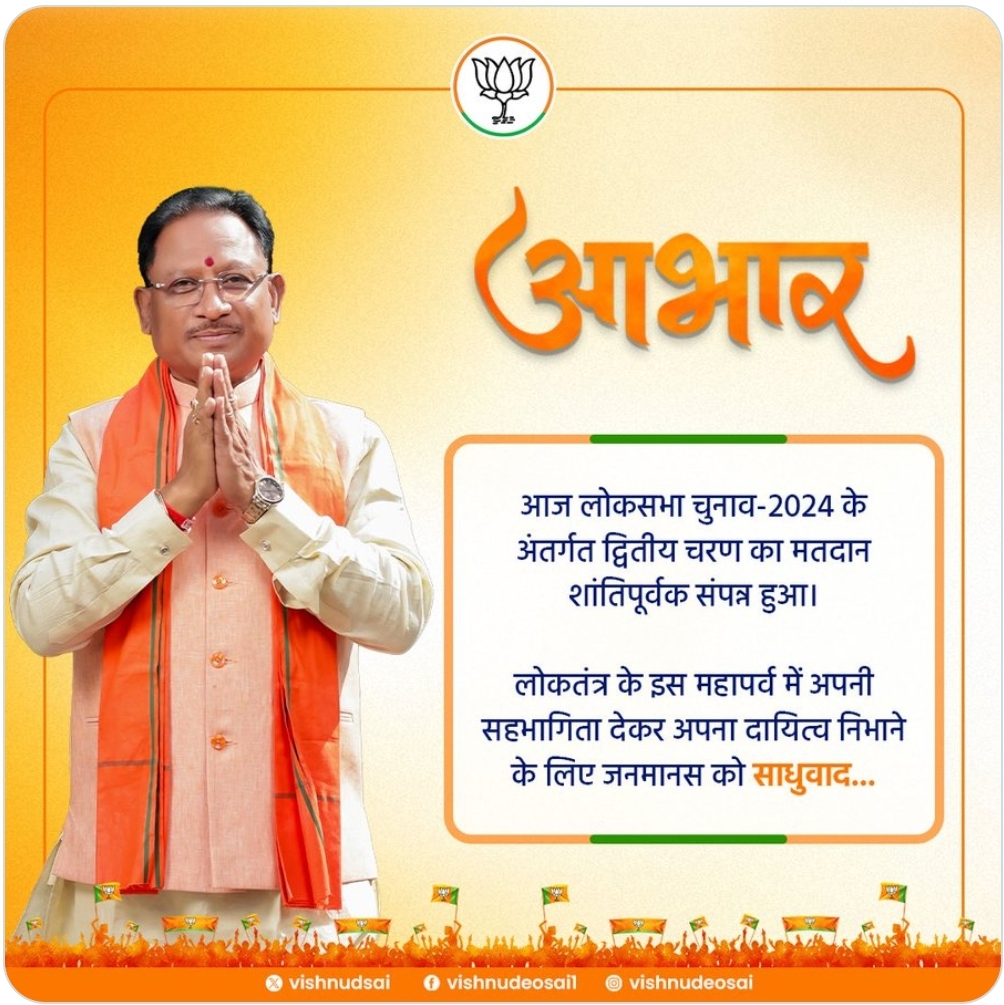 रायपुर। लोकसभा चुनाव के अंतर्गत आज द्वितीय चरण में छत्तीसगढ़ की 3 सीटों राजनांदगांव, महासमुंद, कांकेर सहित देश की 88 सीटों पर मतदान संपन्न हुआ। जिस पर मुख्यमंत्री विष्णु देव साय ने मतदाताओं का आभार जताया।