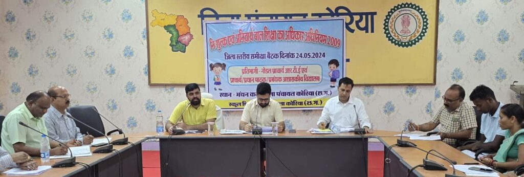 कोरिया 24 मई, 2024 । आज जिला पंचायत के मंथन कक्ष में जिला कलेक्टर श्री विनय कुमार लंगेह की अध्यक्षता में शिक्षा का अधिकार (आर.टी.ई.) के तहत निःशुल्क एवं अनिवार्य बाल शिक्षा का अधिकार अधिनियम 2009 के संबंध में जिला स्तरीय नोडल प्राचार्य आरटीई एवं प्रधानपाठक, प्रबंधक अशासकीय विद्यालय की समीक्षा बैठक की गई।