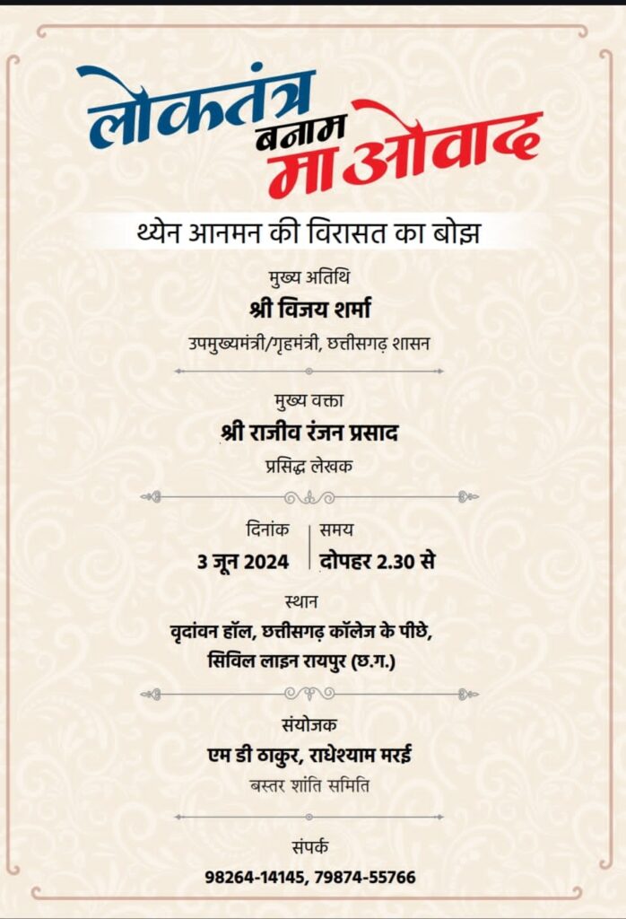 रायपुर। उप-मुख्यमंत्री व गृहमंत्री श्री विजय शर्मा के मुख्य आतिथ्य में “लोकतंत्र बनाम माओवाद – थ्येन आनमन की विरासत का बोझ” विषय पर एक विचार गोष्ठी का आयोजन सोमवार 3 जून को दोपहर 2.30 बजे से वृदांवन हॉल, छत्तीसगढ़ कॉलेज के पीछे, सिविल लाइन रायपुर में किया गया है। बस्तर शांति समिति के श्री एम.डी. ठाकुर व श्री राधेश्याम मरई के संयोजन में आयोजित इस विचार गोष्ठी के मुख्य वक्ता प्रसिद्ध लेखक श्री राजीव रंजन प्रसाद होंगे।