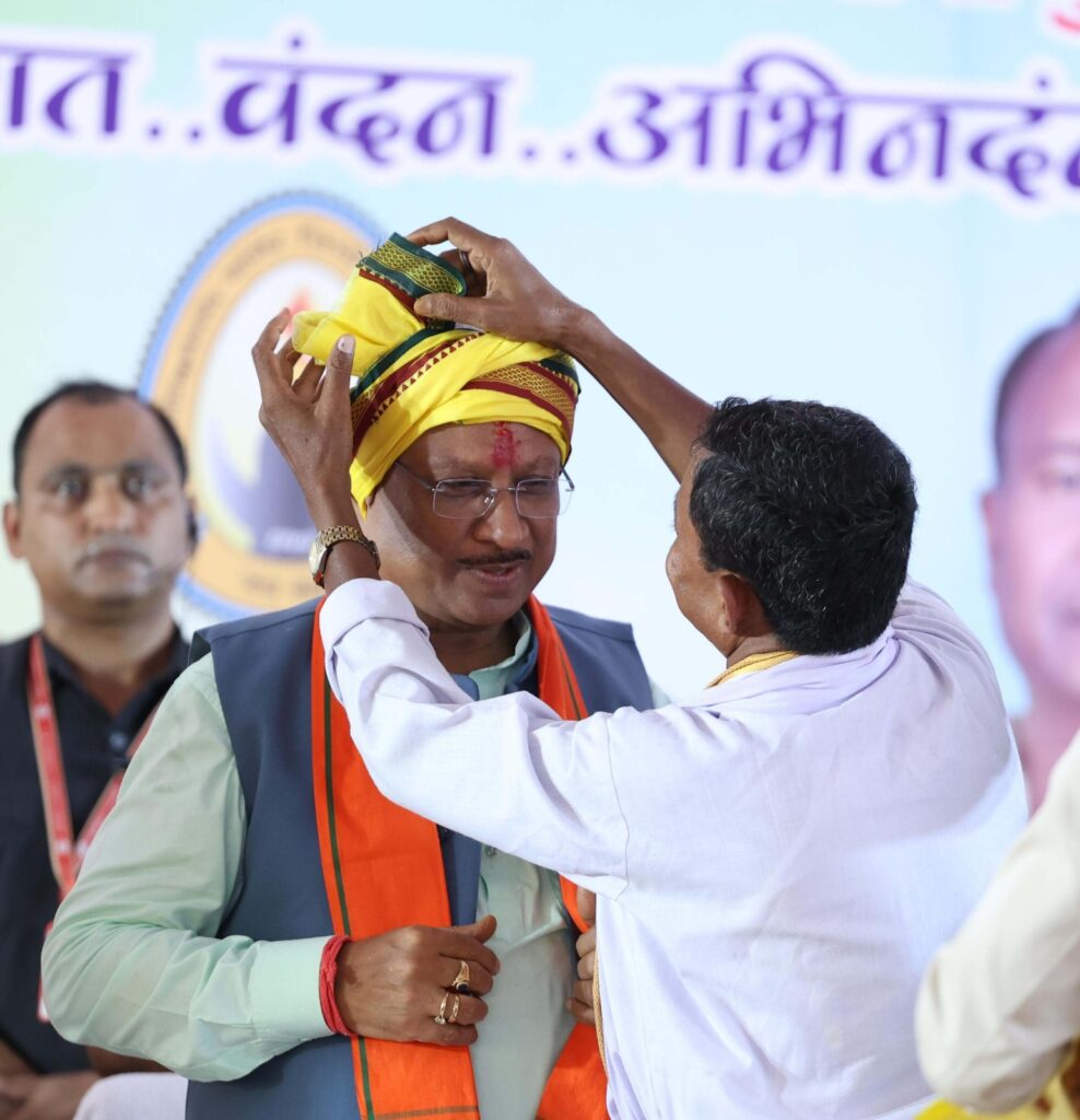 रायपुर, 30 जून 2024/ मुख्यमंत्री श्री विष्णु देव साय आज भाटापारा नगर के कृषि उपज मंडी परिसर में आदिवासी गोंड़ समाज माँ मांवली महासभा द्वारा आयोजित सांस्कृतिक भवन लोकार्पण एवं रानी दुर्गावती बलिदान दिवस समारोह में शामिल हुए। इस दौरान समाज के पदाधिकारियों ने साफा पहनाकर उनका स्वागत किया।