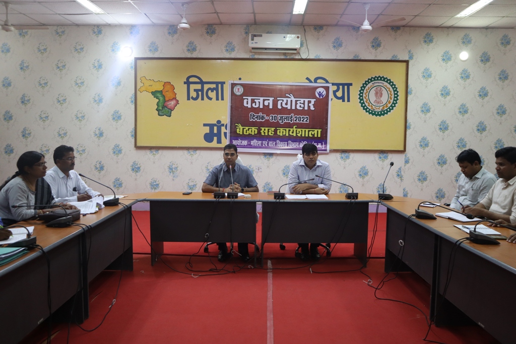 कोरिया 30 जुलाई 2022/कलेक्टर श्री कुलदीप शर्मा की अध्यक्षता तथा जिला पंचायत सीईओ श्री कुणाल दुदावत की उपस्थिति में आज जिला पंचायत के मंथन सभाकक्ष में जिले में आगामी 01 अगस्त से 13 अगस्त 2022 तक आयोजित किए जाने वाले वजन त्यौहार की पूर्व तैयारियों के सम्बंध में बैठक आयोजित किया गया। कुपोषण के प्रति समुदाय को जागरूक करने के लिए प्रत्येक परिवार को उनके बच्चों की सही पोषण की स्थिति को अवगत कराने एवं कुपोषण की सही स्थिति आनलाईन साफ्टवेयर में प्रविष्टि कर ग्राम पंचायत तथा विकासखण्डवार कुपोषण की आंकलन करने की उद्देश्य से जिले में वजन त्यौहार का आयोजन किया जा रहा है, जिसके तहत 06 वर्ष से कम आयु के बच्चों का वजन कर पोषण स्तर ज्ञात किया जायेगा। बैठक में वजन त्यौहार हेतु नियुक्त नोडल अधिकारी, सीडीपीओ, सेक्टर सुपरवाइजर मौजूद रहे।