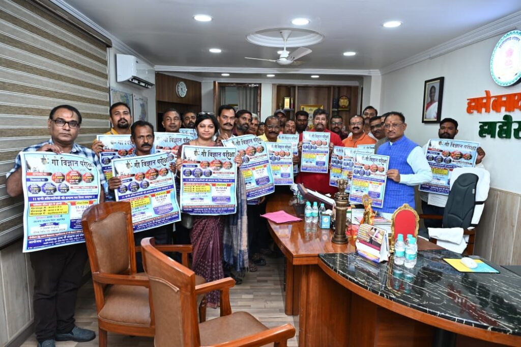 रायपुर 2 सितंबर 2024। छत्तीसगढ़ राज्य गौ संरक्षण एवं संवर्धन समिति द्वारा पूरे छत्तीसगढ़ राज्य में स्कूली एवं कॉलेज के विद्यार्थियों के लिए गौ विज्ञान परीक्षा का आयोजन किया जा रहा है। इस अभियान का श्री गणेश पोला पर्व की पूर्व संध्या पर पोस्टर विमोचन मुख्यमंत्री श्री विष्णुदेव साय की उपस्थिति में मुख्यमंत्री निवास में आयोजित की गई।