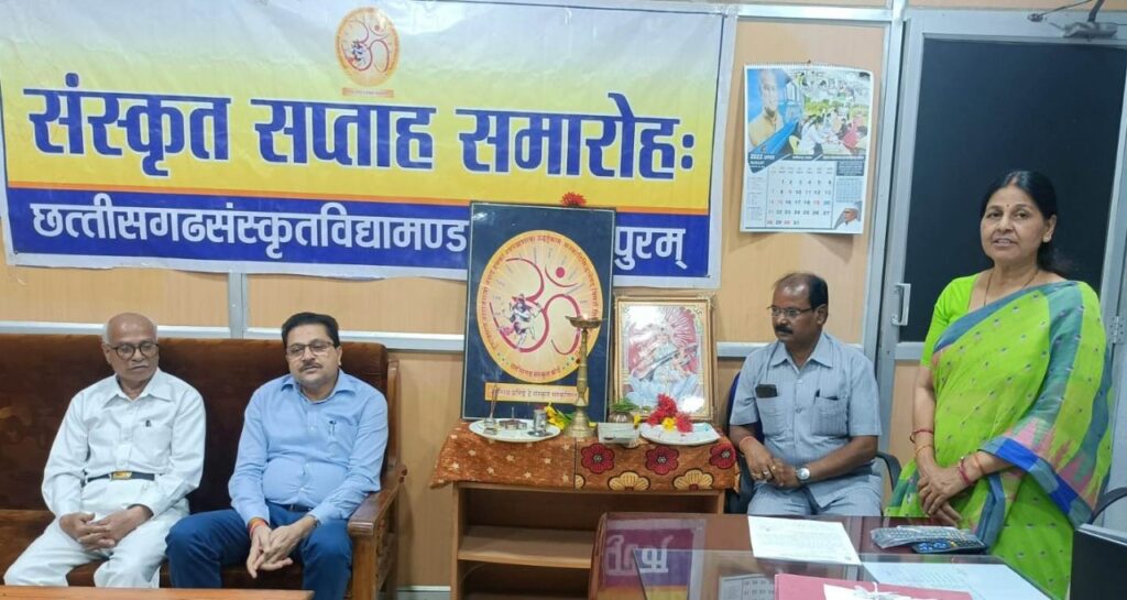 रायपुर, 08 अगस्त 2022/ छत्तीसगढ़ संस्कृत विद्यामण्डलम् में संस्कृत सप्ताह का आयोजन मां सरस्वती एवं संस्कृत विद्यामण्डलम् के प्रतीक चिन्ह भगवान श्री शिव शंकर भोलेनाथ के तैल चित्र पर दीप प्रज्ज्वलित कर कार्यक्रम प्रारम्भ किया गया। कार्यक्रम की अध्यक्षता डा. सुखदेव राम सरस ने की। उल्लेखनीय है कि 8 अगस्त से 14 अगस्त तक आयोजित संस्कृत सप्ताह के दौरान संस्कृत भाषा को बढ़ावा देने विविध कार्यक्रमों का आयोजन होगा।