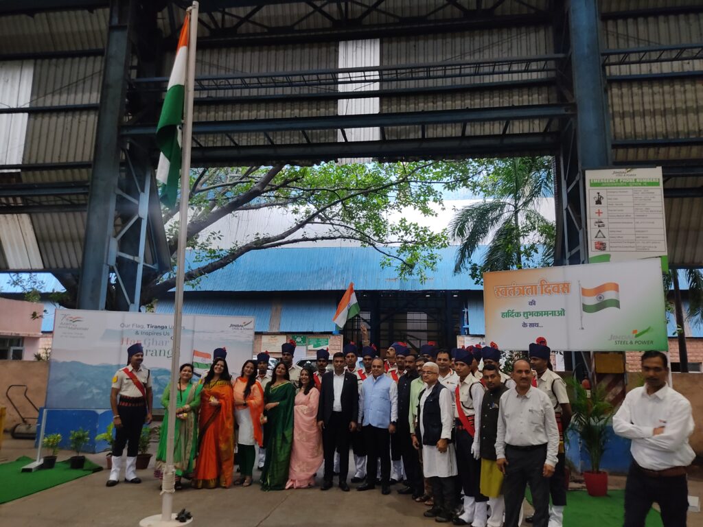 रायपुर,मंगलवार,16/08/2022. आज जिन्दल स्टील एंड पॉवर के मशीनरी डिविज़न, रायपुर में आज़ादी का अमृत महोत्सव की धूम के बीच भारत का छिहत्तर वां स्वतंत्रता दिवस गौरवान्वित रूप से हर्षोल्लास के साथ मनाया गया । चेयरमैन श्री नवीन जिन्दल जी ने अपने संदेश में कहा – यह दिवस, उपलब्धियों पर गर्व करने का अवसर है। निशाने बाज़ी में पहले भारतीय स्वर्ण पदक हेतु मैराज खान जी बधाई के पात्र हैं, उन्होंने 46 वर्ष की उम्र में यह उपलब्धि हासिल कर हम सभी को गौरवान्वित किया है। “मेरा तिरंगा, आपका तिरंगा, हर घर तिरंगा, हर दिन तिरंगा ” हर घर तिरंगा विचार एवं व्यवहार में लाने के लिए अत्यधिक सघर्ष भी हुआ। आज यह मौलिक अधिकारों में है, यह महत्वपूर्ण है। इस अवसर पर रायपुर यूनिट के प्लांट हेड श्री नीलेश शाह जी, कार्मिक प्रमुख सूर्योदय दुबे जी के साथ श्री मुकेश तिवारी, प्रकाश पटेल, कमल शर्मा, नितिन गर्ग, सुरक्षा प्रमुख पाण्डे जी अपनी टीम के साथ उपस्थित रहे। सभी अधिकारियों के साथ उनका परिवार तथा कर्मियों के साथ बच्चों ने भी प्लांट में ही मनाया, आज़ादी का अमृत महोत्सव, भारत का 76 वां स्वतंत्रता दिवस।