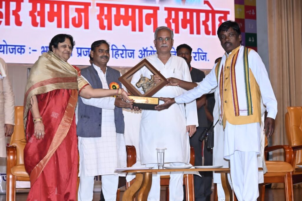 रायपुर। मुख्यमंत्री भूपेश बघेल आज राजधानी रायपुर के इंडोर स्टेडियम में आयोजित कुम्हार समाज के सम्मान समारोह कार्यक्रम में शामिल हुए। इस दौरान उन्होंने समाज के उत्कृष्ट कार्य करने वाले व्यक्तियों को अपने हाथों से सम्मानित किया।