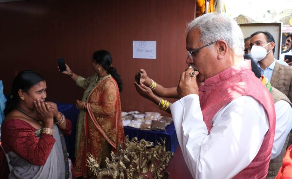 मुख्यमंत्री श्री बघेल ने अंतर्राष्ट्रीय महिला दिवस के अवसर पर बीटीआई ग्राउंड में आयोजित चार दिवसीय राज्य स्तरीय महिला मड़ई में प्रदेशभर से आई महिला स्व-सहायता समूहों द्वारा तैयार उत्पादों की प्रदर्शनी के स्टालों का भी अवलोकन किया। बस्तर के महिला समूहों के स्टॉल से मुख्यमंत्री ने बेलमेटल से निर्मित कला कृति खरीदी और तुरही बजा कर महिलाओं के उत्साह को दोगुना कर दिया।