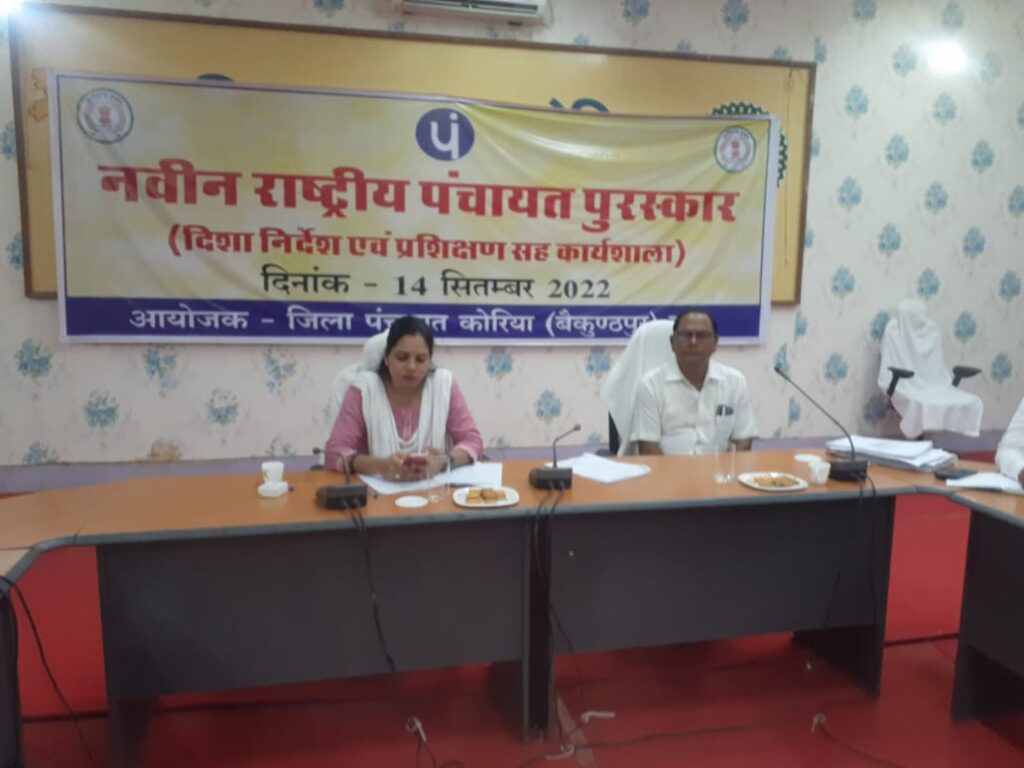 कोरिया 14 सितम्बर 2022/पंचायती राज मंत्रालय भारत सरकार के द्वारा पंचायती राज संस्थाओं को प्रोत्साहित करने व सतत् विकास के 9 चिन्हित लक्ष्यों को पंचायत राज संस्थाओं पंचायत स्तर से कार्यान्वित कराये जाने हेतु जिला पंचायत के मुख्य कार्यपालन अधिकारी श्री कुणाल दुदावत के निर्देश पर 14 सितम्बर 2022 को जिला पंचायत के मंथन सभाकक्ष में संबंधित विभाग के जिला, अनुभाग एवं खण्डस्तरीय अधिकारियों तथा कर्मचारियों की नवीन राष्ट्रीय पंचायत पुरस्कार प्रणाली के तहत प्रशिक्षण सह कार्यशाला आयोजित की गई, जिसमें विभिन्न विभागों के अधिकारी-कर्मचारियों ने सम्मिलित होकर प्रशिक्षण प्राप्त किया गया।