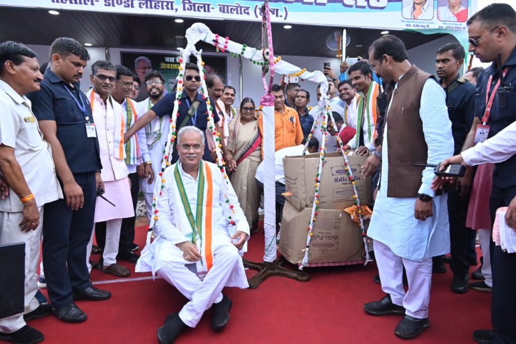 छत्तीसगढ़िया मुख्यमंत्री को अईरसा पकवान से तौलकर जेवरतला के ग्रामीणों ने किया स्वागत