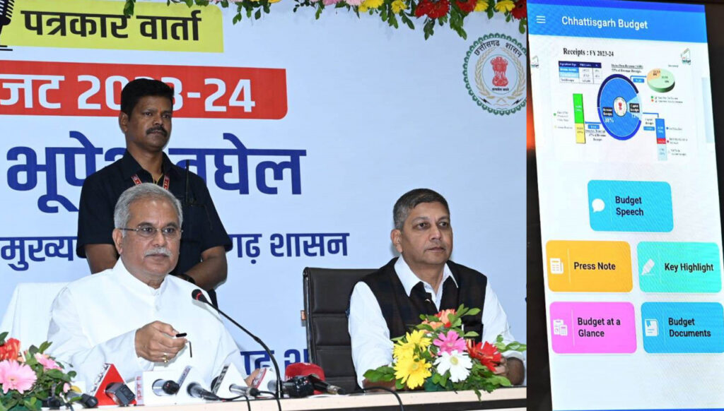 रायपुर, 06 मार्च 2023 : छत्तीसगढ़ के मुख्यमंत्री श्री भूपेश बघेल ने आज छत्तीसगढ़ विधानसभा में वर्ष 2023-24 का वार्षिक बजट प्रस्तुत किया गया। बजट प्रस्तुत करने के उपरांत मुख्यमंत्री द्वारा बजट पर आयोजित पत्रकार वार्ता के प्रारंभ में वित्त विभाग द्वारा एन.आई.सी. के सहयोग से निर्मित बजट के मोबाईल एप लांच किया।