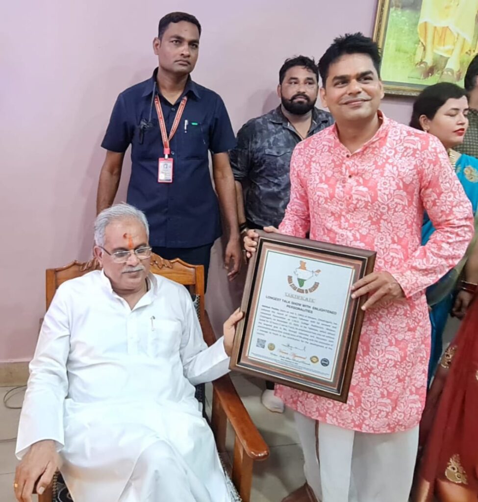 मुख्यमंत्री भूपेश बघेल ने विश्व रिकॉर्ड का प्रमाण पत्र देकर अभिनेता अखिलेश पांडे का किया सम्मान