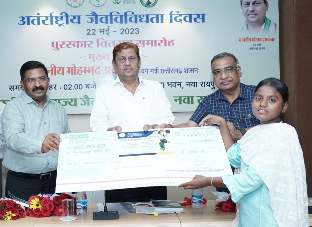 कार्यक्रम में राज्य स्तरीय जैवविविधता पुरस्कार 2023 की घोषणाएं की गई तथा वनमंत्री श्री अकबर द्वारा चयनित संस्थाओं एवं व्यक्तियों को पुरस्कार वितरित किया गया। इनमें जैवविविधता प्रबंधन समिति धमनी बलौदाबाजार, श्री शिवकुमार चंद्रवंशी ग्राम कोको, माँ रूपई इको क्लब कसेकेरा महासमुंद, डॉ. जसमीत सिंह असिस्टेंट प्रोफेसर कामधेनु विश्वविद्यालय दुर्ग, पीपुल फॉर एनिमल वाईल्ड लाईफ ट्रस्ट ऑफ इंडिया, कंजरवेशन कोर सोसायटी बिलासपुर, श्री वीरेन्द्र सिंह ग्रीन कमांडो जिला बालोद, डॉ विश्वनाथ पाणिग्रही बागबहरा, श्री अनुप रंजन पाण्डे, श्री राजवाडे ग्राम सोनपुरखुर्द को विभिन्न वर्गों में पुरस्कार प्रदान किए गए। इस अवसर पर सदस्य सचिव श्री अरूण कुमार पाण्डेय, वैज्ञानिक एम.एल. नायक, डॉ. आर.पी. मिश्रा द्वारा तैयार की गई पुस्तक ‘बायोडायवर्सिटी ऑफ छत्तीसगढ़’ का विमोचन भी वनमंत्री द्वारा किया गया। इसके अतिरिक्त जैवविविधता के क्षेत्र में जागरूकता लाने हेतु स्कूल व कॉलेज के छात्र-छात्राओं के लिए आयोजित ऑनलाईन निबंध पोस्टर एवं स्लोगन प्रतियोगिता के विजेताओं को भी मुख्य अतिथि के द्वारा पुरस्कार वितरण किया गया।