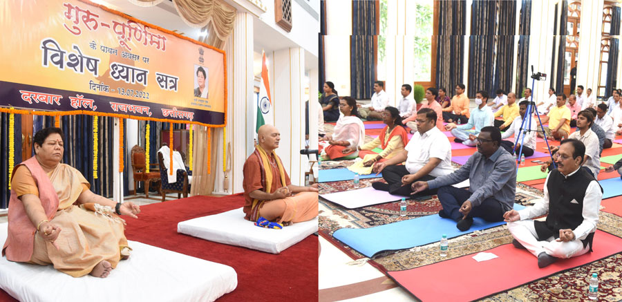 रायपुर, 13 जुलाई 2022 : ध्यान और योग हमारी प्राचीन संस्कृति की देन है। मेडिटेशन से मानसिक तनाव से मुक्ति मिलती है। साथ ही दृष्टिकोण सकारात्मक होता है। मेडिटेशन वह माध्यम है जिससे हम आंतरिक ऊर्जा को जागृत कर सकते हैं। यह बात राज्यपाल ने कही। राज्यपाल राजभवन के दरबार हॉल में गुरू पूर्णिमा के अवसर पर आयोजित विशेष ध्यान सत्र को सम्बोधित कर रही थी। गौरतलब है कि राजभवन सचिवालय के अधिकारी-कर्मचारियों के लिए आज राजभवन में विशेष ध्यान सत्र का आयोजन किया गया था।