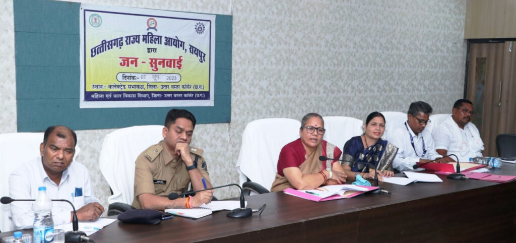 उत्तर बस्तर कांकेर 07 जून 2023 : छत्तीसगढ राज्य महिला आयोग के अध्यक्ष डॉ. किरणमयी नायक एवं सदस्य बालो बघेल ने आज जिला पंचायत के सभाकक्ष में महिला उत्पीड़न से संबंधित प्रकरणों पर जन सुनवाई की। छत्तीसगढ़ महिला आयोग के अध्यक्ष डॉ. किरणमयी नायक की अध्यक्षता में आज प्रदेश स्तर की 182 वी सुनवाई हुई कांकेर जिले में आयोजित जन सुनवाई में 17 प्रकरणों पर सुनवाई की गई।