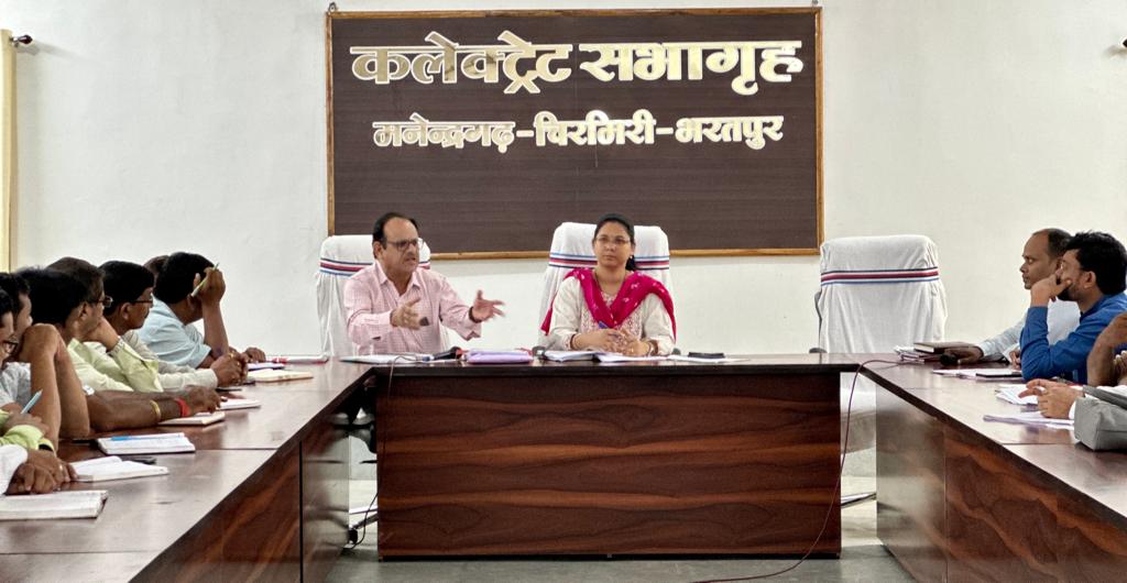 मनेंद्रगढ़, 27 जून 2023 / कलेक्टर श्री नरेंद्र कुमार दुग्गा के निर्देशानुसार अपर कलेक्टर श्रीमती नयनतारा सिंह तोमर की अध्यक्षता में कलेक्ट्रेट सभाकक्ष में मंगलवार को सर्व गोठान नोडल अधिकारियों की समीक्षा बैठक आयोजित की गई। बैठक में में सभी अधिकारियों को प्रति गौठान प्रतिदिन कम से कम 2 क्विंटल गोबर खरीदी करने एवं गौठान में वर्मी खाद उत्पादन की नियमित निरीक्षण करने के निर्देश दिए गये। गौठान में उत्पादित वर्मी कंपोस्ट को समिति के माध्यम से उठाव करने के साथ साथ गौठान की मूलभूत संरचनाओं के विकास की समीक्षा की गई।