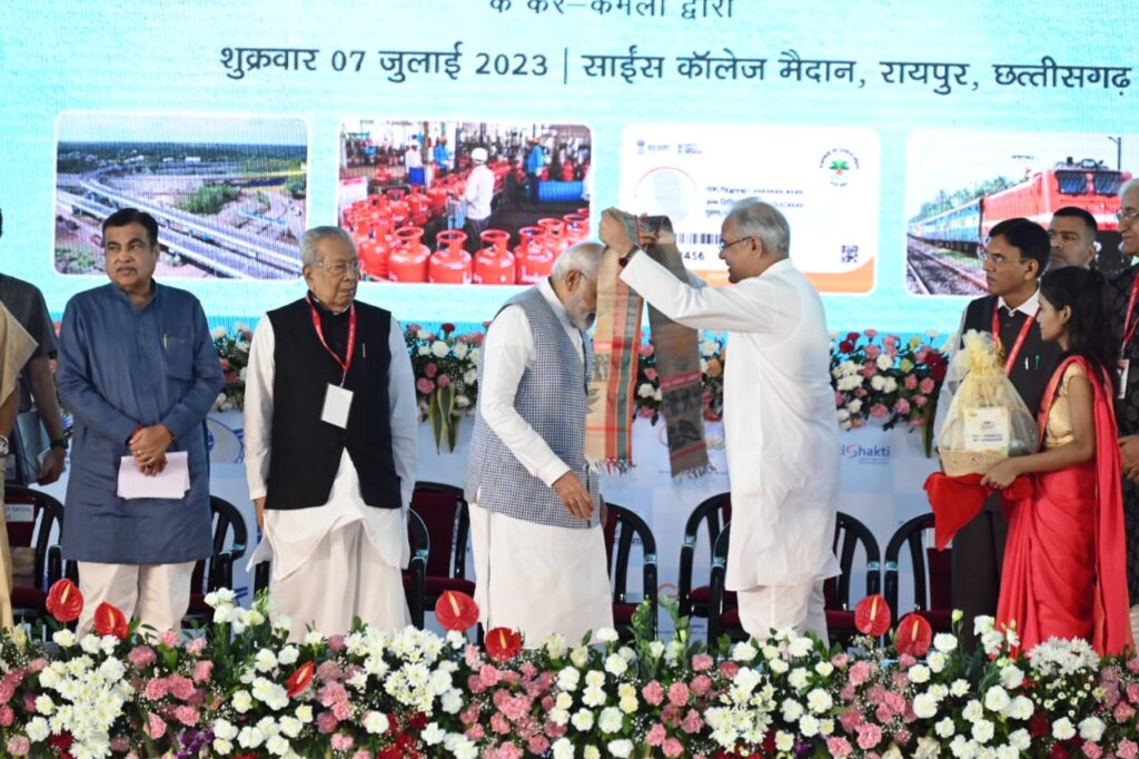 रायपुर,मुख्यमंत्री श्री भूपेश बघेल ने समारोह को संबोधित करते हुए कहा कि यह हमारे लिए बहुत खुशी की बात है कि हमारे प्रधानमंत्री छत्तीसगढ़ के दौरे में आये हैं। प्रभु श्रीराम के ननिहाल और माता कौशल्या की भूमि में मैं उनका स्वागत करता हूँ। प्रधानमंत्री जी से हम अनेक मंचों में मिलते हैं और नीति आयोग आदि की बैठकों में मिलते हैं। हम मांगे भी करते हैं लेकिन उन्हें और दोहराना नहीं चाहता। मैं गडकरी जी के साथ भी बैठता हूँ जितना मांगते हैं उससे ज्यादा ही देते हैं। हम तो मांगते ही रहेंगे लेकिन और ज्यादा नहीं कहना चाहता हूूँ, फिर भी इतना कहना चाहता हूँ कि हमारा राज्य नवोदित राज्य है इसलिए ज्यादा से ज्यादा मदद हमको मिलती रहे।