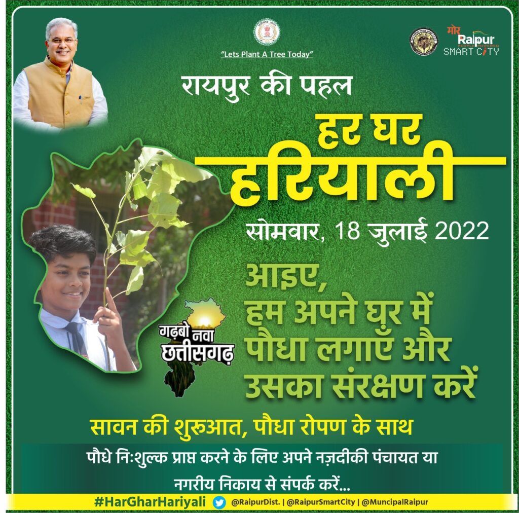 जिला प्रशासन के प्रयास से 18 जुलाई को हर घर हरियाली वृक्षारोपण की शुरूआत की जा रही है। सभी नगर वासियों से अपील है कि इस अभियान से जुड़कर अपने घरों, आस-पास रिक्त भूमि पर पौधे रोपित कर उसका संरक्षण करें – *श्री सत्यनारायण शर्मा, विधायक, रायपुर (ग्रामीण)*