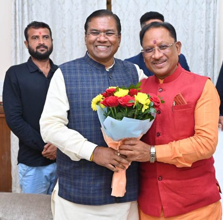 रायपुर, 15 दिसम्बर 2023/मुख्यमंत्री श्री विष्णु देव साय से आज शाम यहां राजधानी रायपुर स्थित राज्य अतिथि गृह ‘पहुना’ में केंद्रीय ग्रामीण विकास राज्य मंत्री श्री फग्गन सिंह कुलस्ते ने सौजन्य मुलाकात की। मुख्यमंत्री श्री साय को श्री कुलस्ते ने छत्तीसगढ़ के मुख्यमंत्री का पदभार ग्रहण करने पर हार्दिक बधाई एवं शुभकामनाएं दीं। केंद्रीय ग्रामीण विकास राज्य मंत्री श्री कुलस्ते ने आशा जतायी कि श्री साय के नेतृत्व में राज्य प्रगति के पथ पर अग्रसर होगा। मुख्यमंत्री श्री विष्णु देव साय ने श्री कुलस्ते के प्रति आभार जताया।
