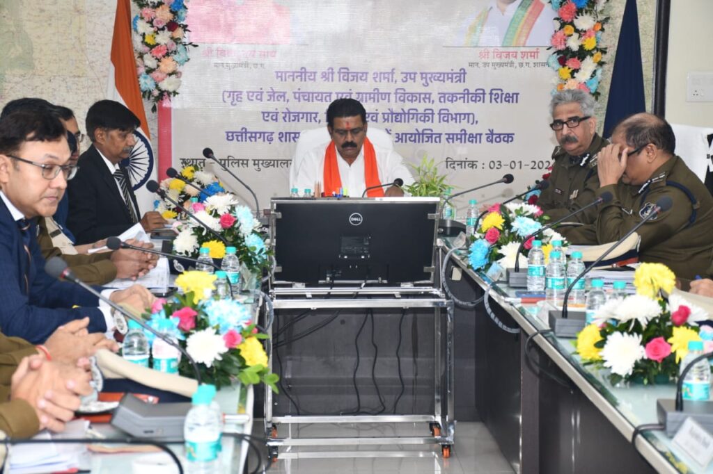 रायपुर 03 जनवरी 2024/ उप मुख्यमंत्री एवं गृह मंत्री श्री विजय शर्मा ने आज यहां पुलिस मुख्यालय, अटल नगर, नवा रायपुर में वरिष्ठ पुलिस अधिकारियों की समीक्षा बैठक ली। उन्होंने विभाग के प्रशासन शाखा, योजना, प्रबंध शाखा और अपराध शाखा सहित अन्य विभागीय कार्यों की समीक्षा की। उन्होंने कहा कि शासन द्वारा बनाए गए कानून व्यवस्था का उचित तरीके से पालन करते हुए आमजनों को समय पर न्याय दिलाना सुनिश्चित करें।
