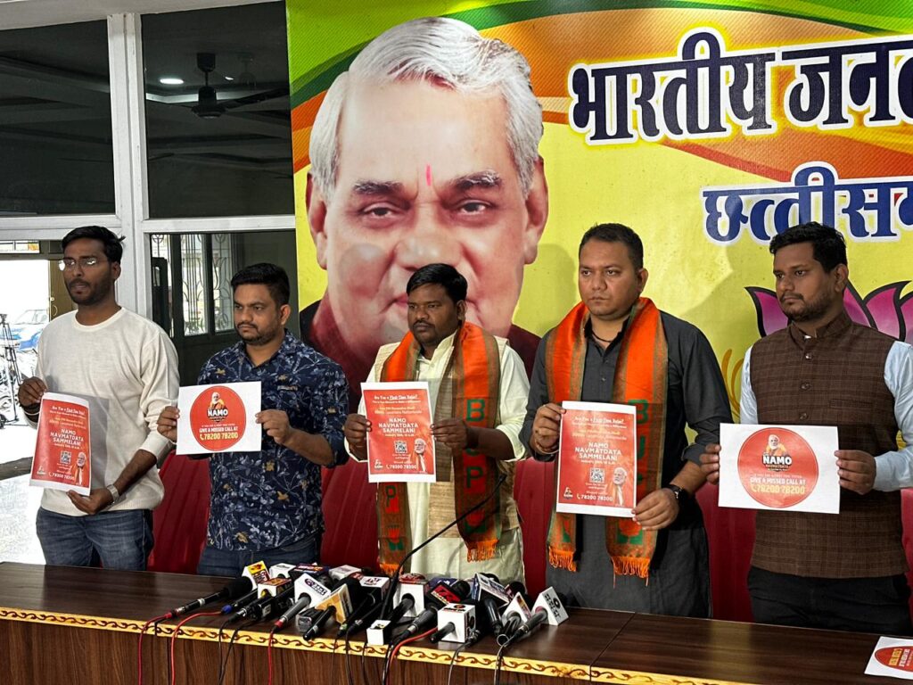रायपुर। भारतीय जनता युवा मोर्चा के प्रदेश अध्यक्ष रवि भगत ने सोमवार को भाजपा कार्यालय एकात्म परिसर में आयोजित पत्रकार वार्ता में कहा कि भाजपा ने आगामी लोकसभा चुनाव के मद्देनजर अपनी कार्य योजना बनाई हैै। इसी परिप्रेक्ष्य में भाजयुमो द्वारा नव मतदाता सम्मेलन किया जा रहा है। इस अभियान से प्रधानमंत्री नरेन्द्र मोदी 25 जनवरी 2024 को पूरे देशभर के 5000 एवं छत्तीसगढ़ के 176 स्थानों के नव मतदाताओं से लाइव कॉन्फ्रेंस के माध्यम से जुड़ेंगे। इसमें 3 लाख से ज्यादा नवयुवकों से प्रधानमंत्री श्री मोदी सीधे संवाद करेंगे।