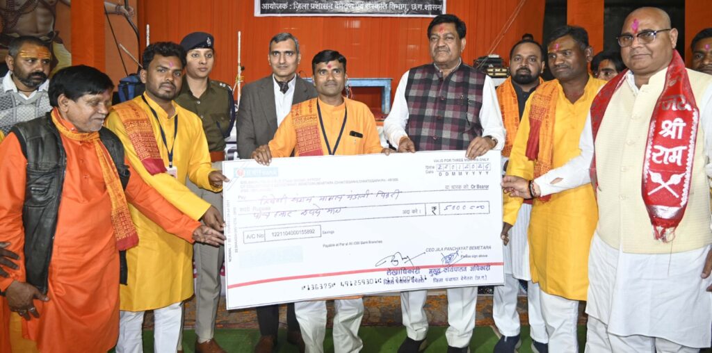 रायपुर, 23 जनवरी 2024/ खाद्य नागरिक आपूर्ति एवं उपभोक्ता संरक्षण मंत्री श्री दयालदास बघेल विगत दिवस बेमेतरा जिला मुख्यालय के श्री राम मंदिर में दीपदान, गंगा आरती और रामायण मानस गायन में शामिल हुए। जिला प्रशासन द्वारा कलाजत्था के माध्यम से सभी विकासखण्डों में सांस्कृतिक कार्यक्रमों का आयोजन किया गया था। श्री बघेल ने भक्तिमय गाने का आनंद लिया। उन्होंने कार्यक्रम में पंजीकृत त्रिवेणी संगम मानस मण्डली पिकरी एवं जय मां शीतला मानस मण्डली भिलौरी को 5-5 हजार रूपए प्रोत्साहन राशि देकर सम्मानित किया।