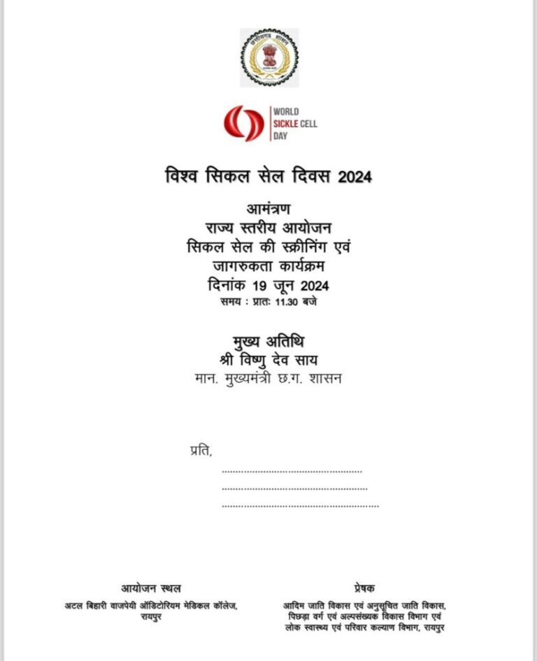 मुख्यमंत्री श्री विष्णु देव साय 19 जून को राज्य स्तरीय सिकलसेल स्क्रीनिंग एवं जागरूकता कार्यक्रम में होंगे शामिल रायपुर, 18...
